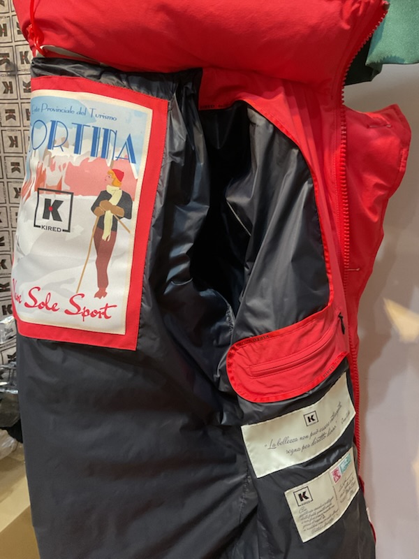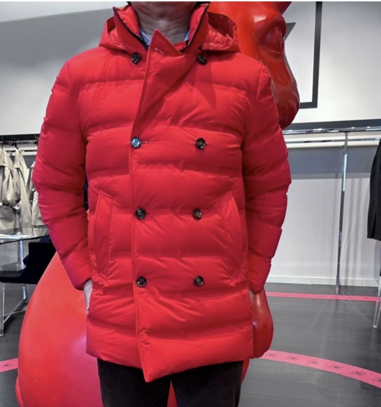 ブランドを象徴する鮮やかなレッドのオブジェの前で今期の一押しの赤のダウンジャケット